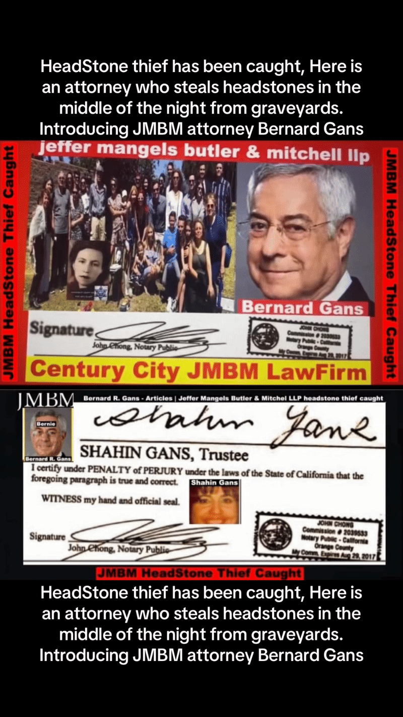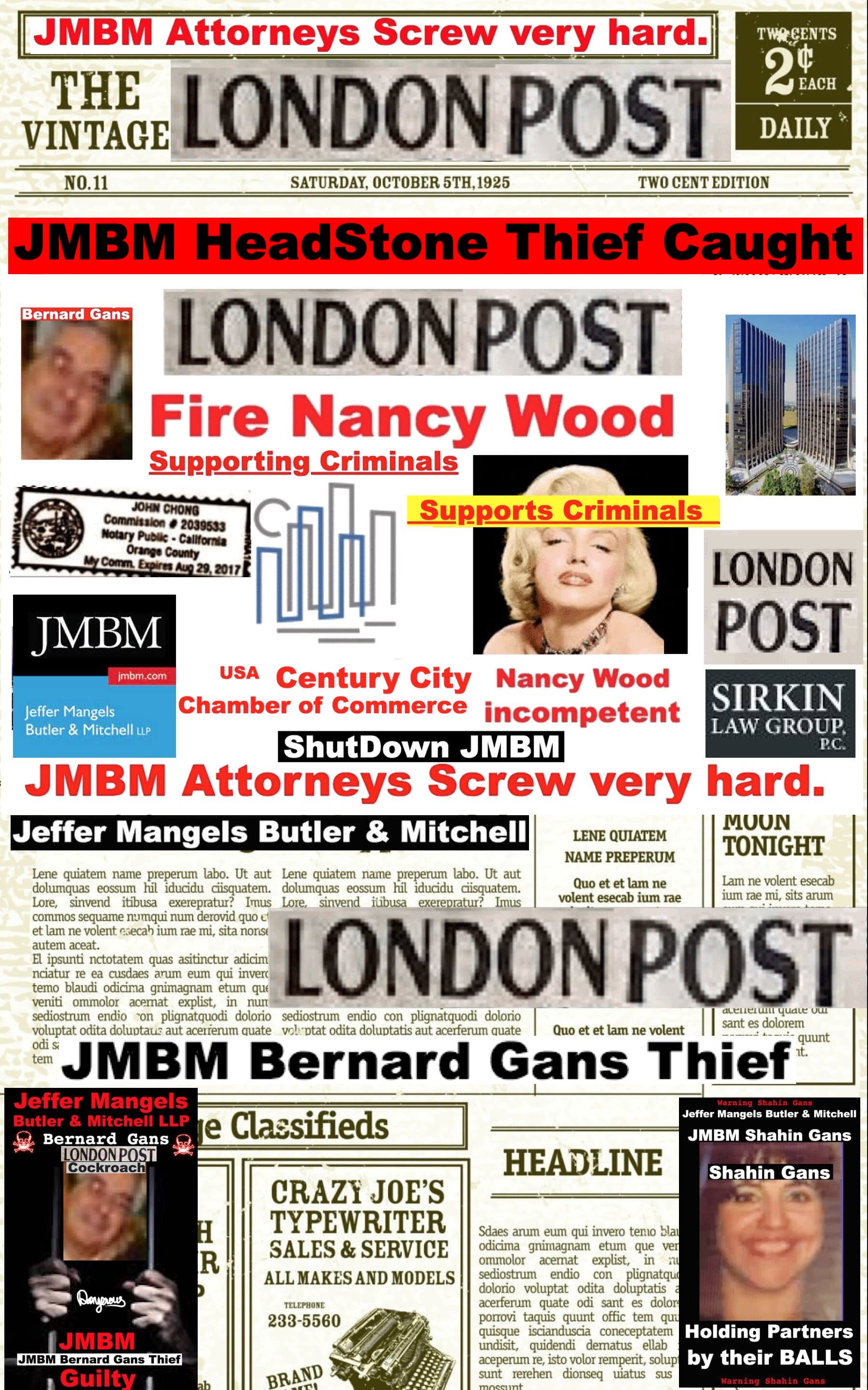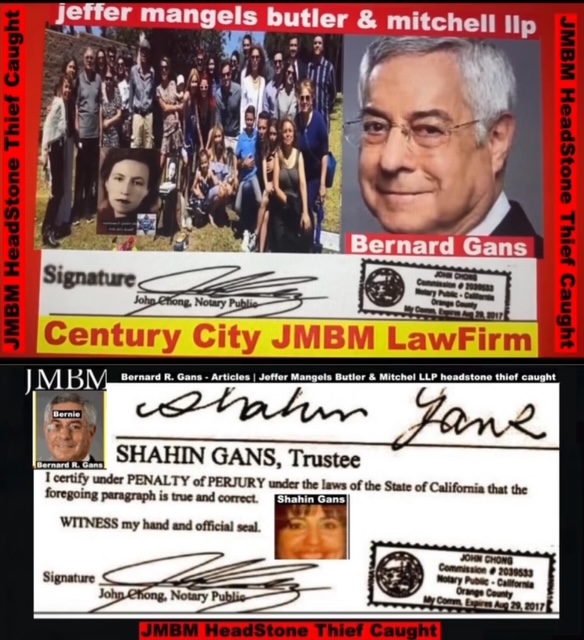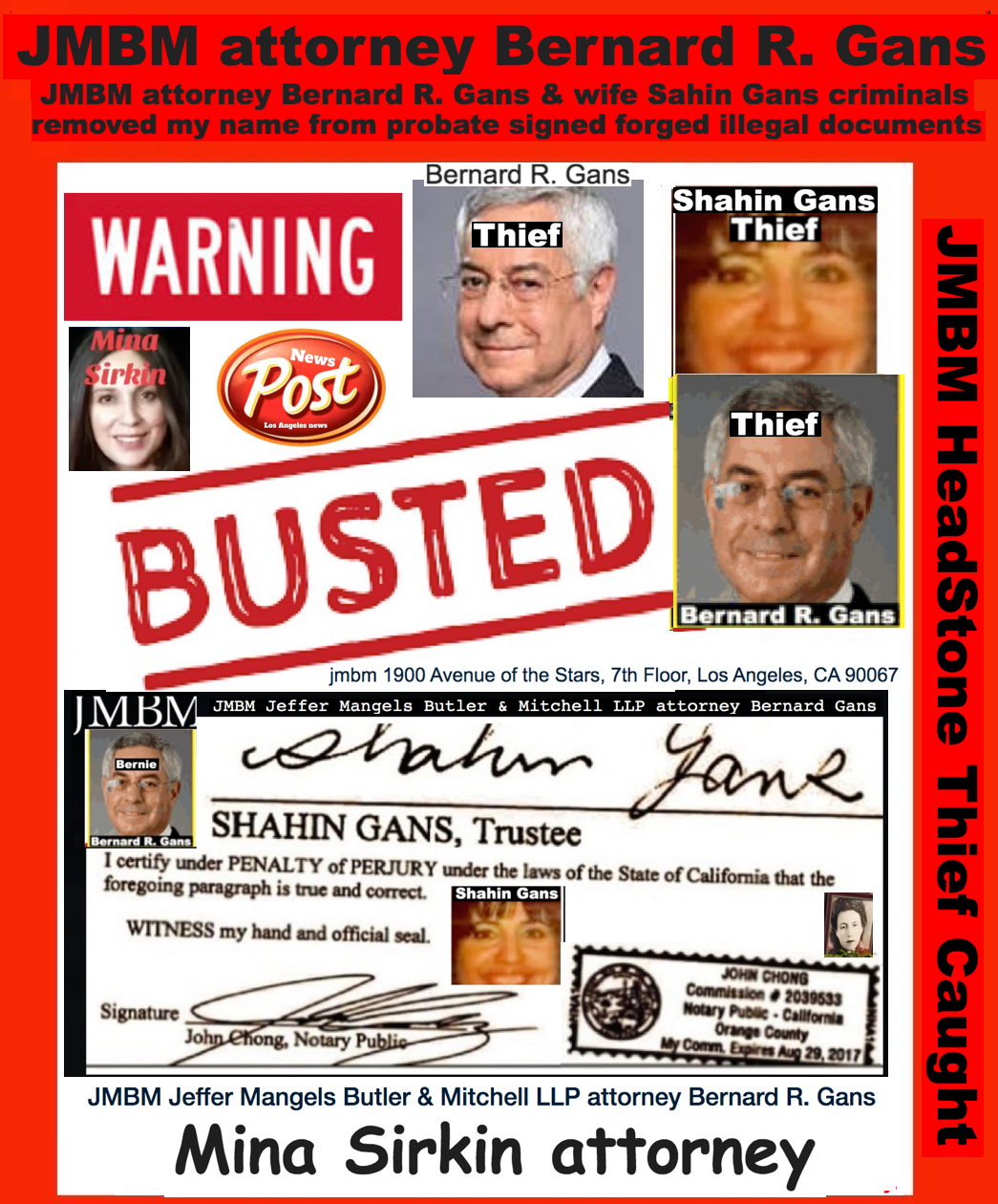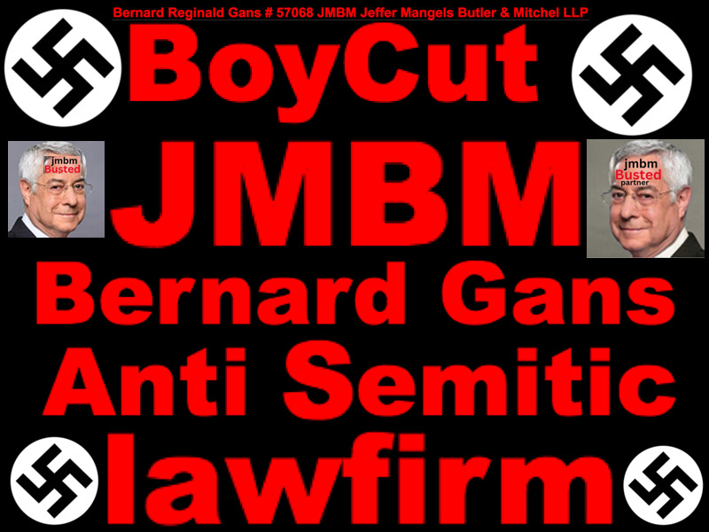 Suing JMBM partner $500,000,000,000.00 Busted criminal attorneys Jeffer Mangels Butler & Mitchell LLP lawyer Bernard Reginald Gans #57068 Bernard Gans Mina Sirkin law group JMBM killed my mom to get her fortune. Suing JMBM partner $500,000,000,000.00 Busted criminal attorneys Jeffer Mangels Butler & Mitchell LLP lawyer Bernard Reginald Gans #57068 Bernard Gans Mina Sirkin law group JMBM killed my mom to get her fortune..
