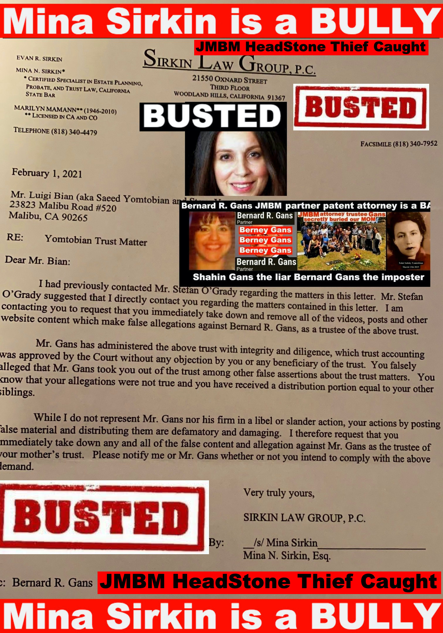 Suing JMBM partner $500,000,000,000.00 Busted criminal attorneys Jeffer Mangels Butler & Mitchell LLP lawyer Bernard Reginald Gans #57068 Bernard Gans Mina Sirkin law group JMBM killed my mom to get her fortune.